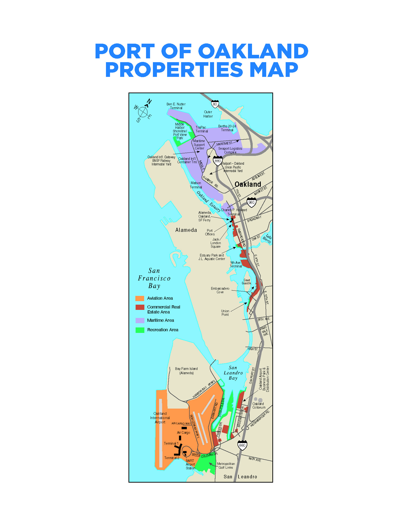 The Port of Oakland oversees the Oakland seaport, Oakland International Airport, and 20 miles of waterfront. Together with its business partners, the Port supports more than 73,000 jobs in the region and nearly 827,000 jobs across the United States. Connect with the Port of Oakland and Oakland International Airport through Facebook, or with the Port on Twitter, YouTube, and at www.portofoakland.com.